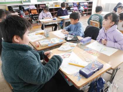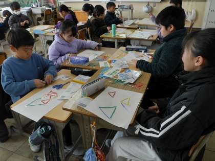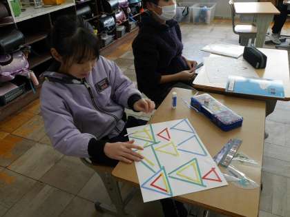 いろいろな長さの棒を組み合わせて三角形を作っていました。