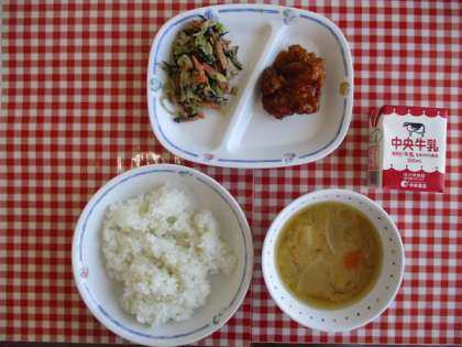 今日の給食は、『ごはん、麦みそ汁、ひじきと野菜のねりごまあえ、とり肉の甘辛しょうゆ揚げ、牛乳』です。