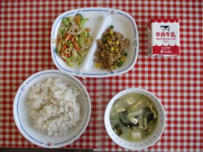 今日の給食は、『ごはん、豆腐とわかめのみそ汁、れんこんサラダ、ツナそぼろ丼、牛乳』です。