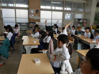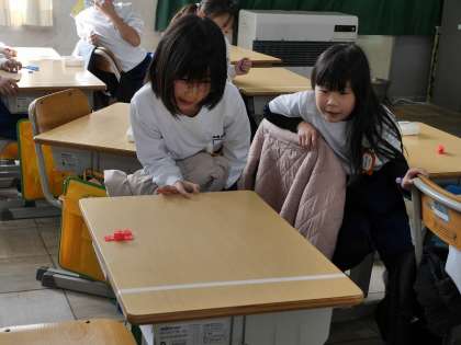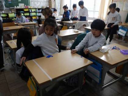 おはじきをはじいて、白線より向こうで止めたら10点、手前なら1点、机から落ちたら0点というルールで遊びました。