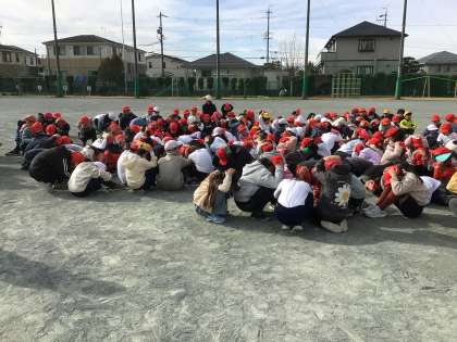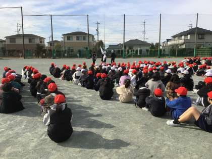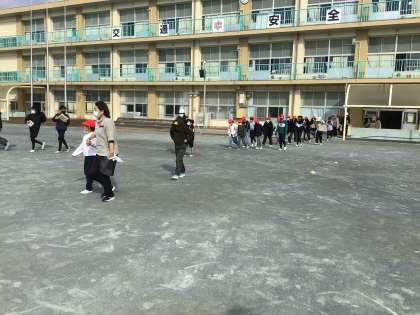 ある日突然地震が来ても自分自身で考えて避難できるようにするために、いつ訓練を行うのかを子どもたちに知らせずに実施しました。朝日タイムに行いましたが、すばやくしゃがんで避難することができました。