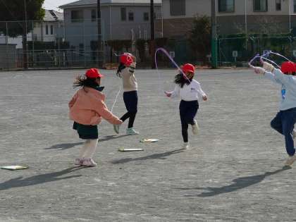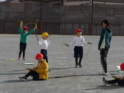 なわとびの学習です。 風が強くて少し跳びにくそうでしたが、みんな頑張って跳んでいました。