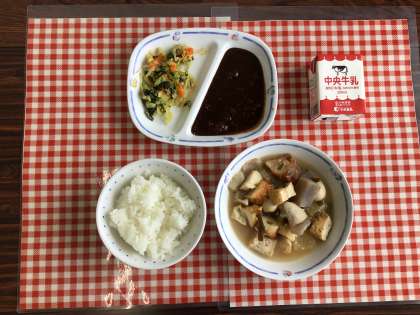 今日の給食は、『ごはん、おでん、アーモンドあえ、肉みそ、牛乳』です。