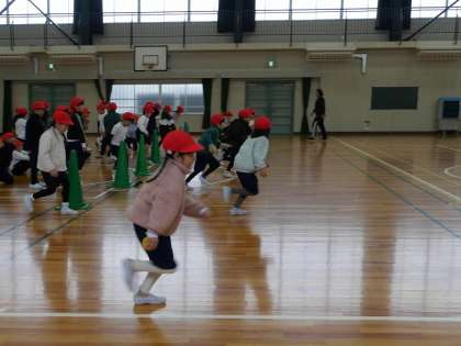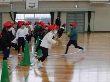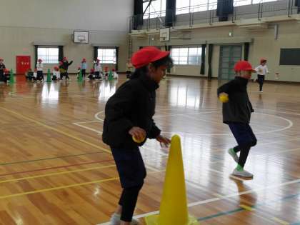 ボールをバトン代わりに、カラーコーンまでを折り返すリレーをしていました。