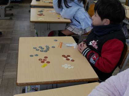 28円を払うとき500円玉、100円玉、10円玉、5円玉、1円玉を使って、どのように払うかを考えました。