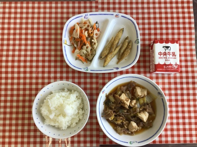 今日の給食は、『ごはん、すきやき風煮、煮あえ、わかさぎのから揚げ、牛乳』です。