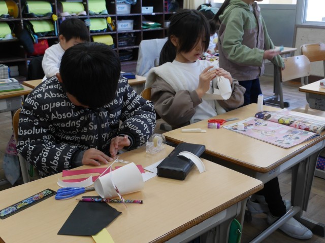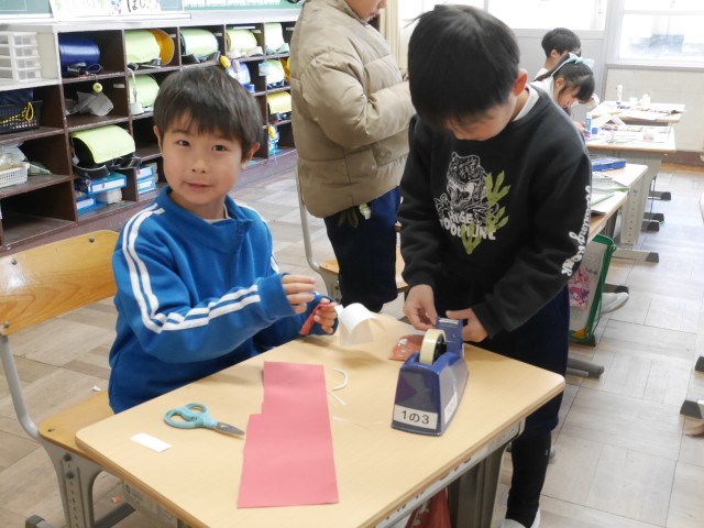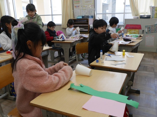 紙コップや紙袋を使ってぱくぱく動く口のあるおもちゃ作りをしています。