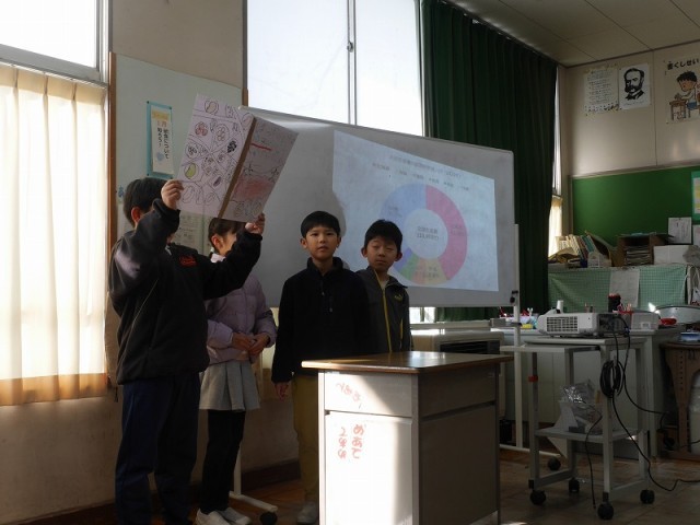 これまで行ってきた味噌蔵や豆腐店の見学や豆腐作りなどの学習の成果をグループごとに発表しました。