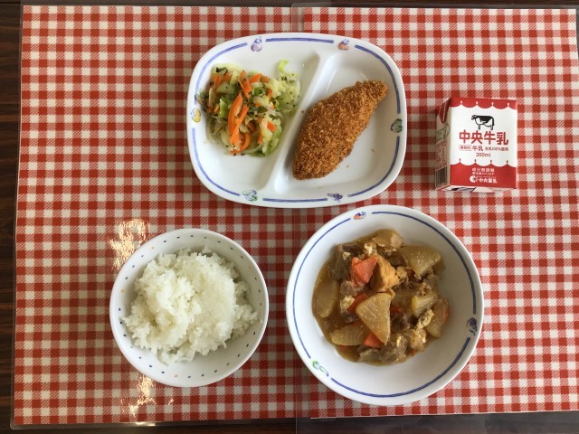 今日の給食は、『ごはん、だいこんと豚肉の煮物、青菜あえ、ほっけフライ、牛乳』です。