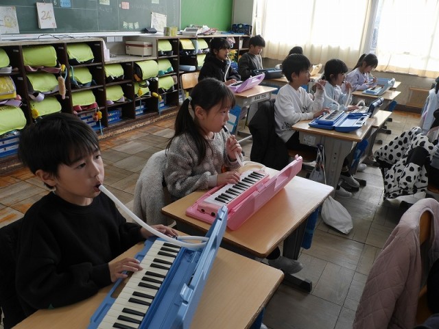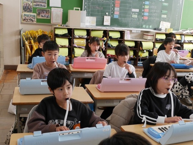 1組はカスタネットで拍子打ちを、3組は鍵盤ハーモニカでみんなでそろえて演奏をしていました。