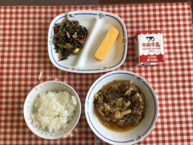 今日の給食は、『ごはん、ひきずり、ひじきサラダ、厚焼き卵、牛乳』です。