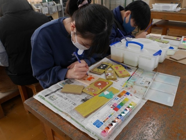 ラックの部材のデザインに絵の具で着色したり、彫刻刀で浮き彫りにしたりする作業に取り組んでいました。
