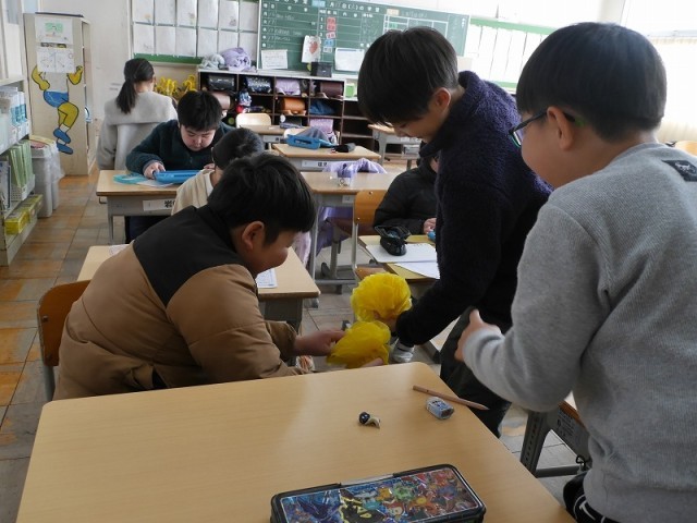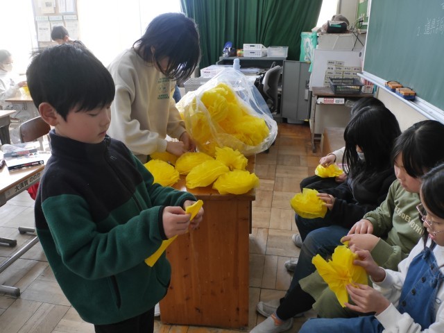 6年生を送る会に向けて会場に飾る花飾りを作っていました。