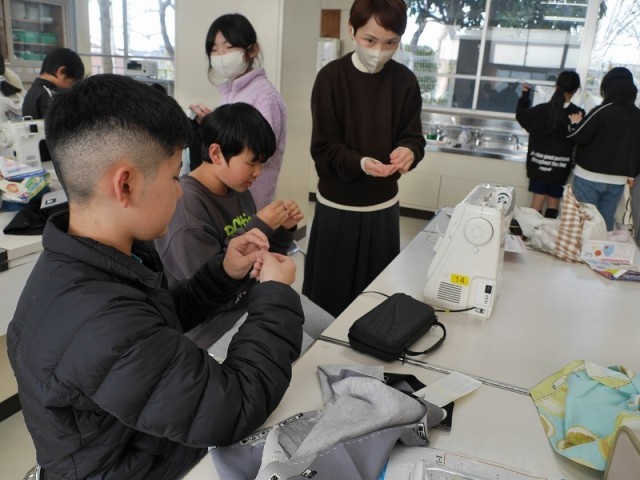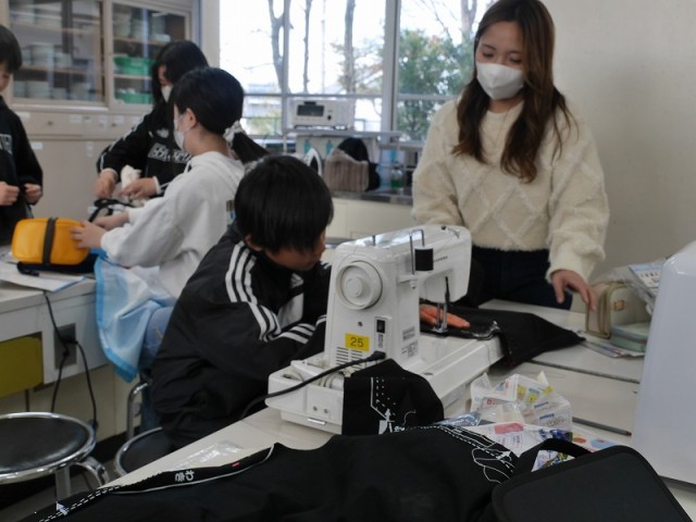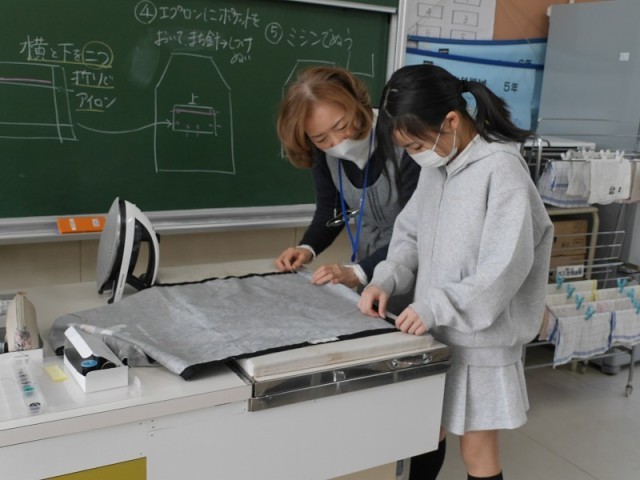 エプロンの両サイドや首掛け周りをミシンで縫う学習です。