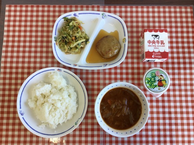 今日の給食は、『ごはん、キムチ入りみそ汁、ごまあえ、とよたひまわりポークハンバーグの照り焼きソースかけ、抹茶プリン、牛乳』です。