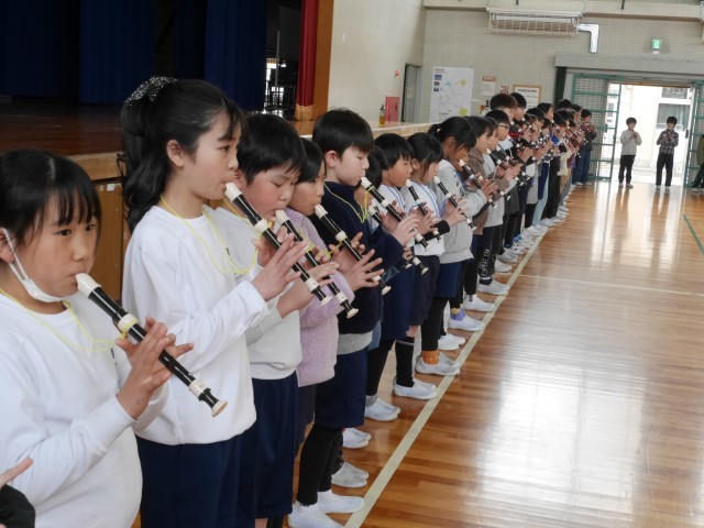 3・4年生が6年生を送る会に向けて、メッセージやリコーダー演奏の練習をしていました。