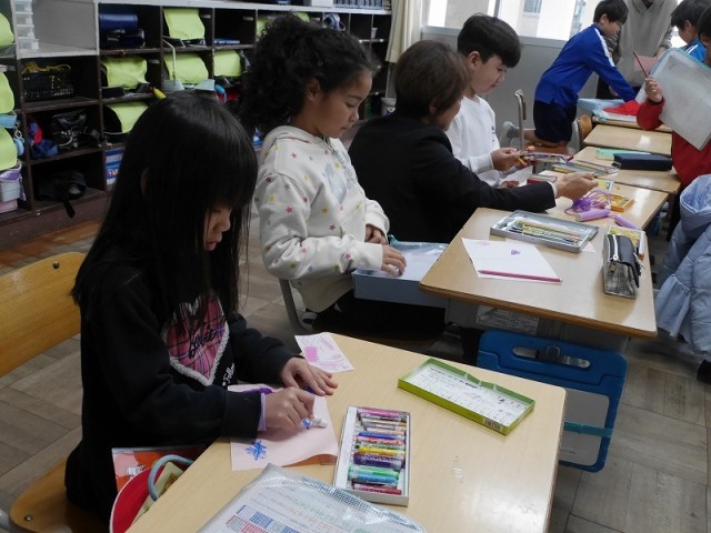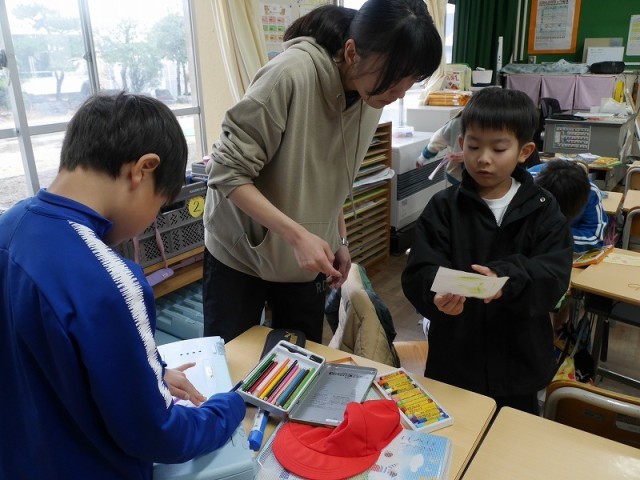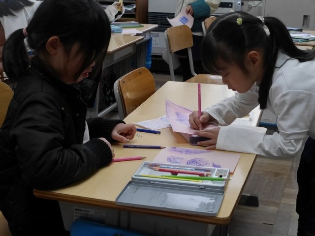 身の回りの様々なものに紙を当て、上から色鉛筆やクレヨンでこすりつけて形を浮き上がらせていました。