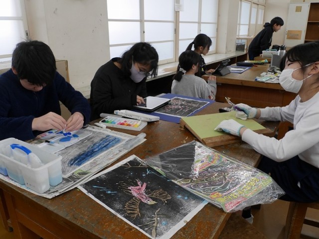 版画作品の裏から絵具で着色していました。