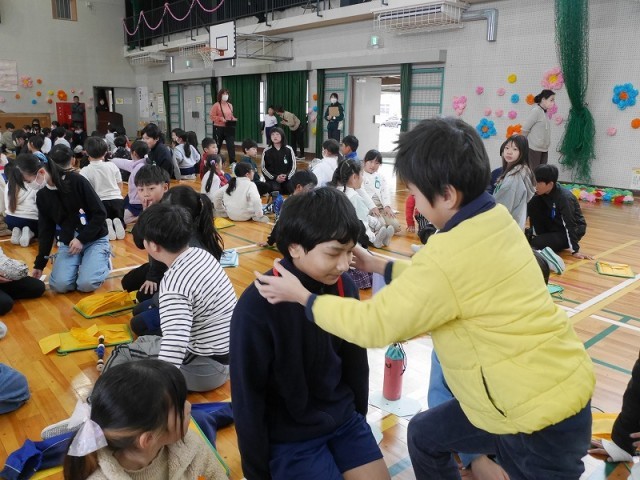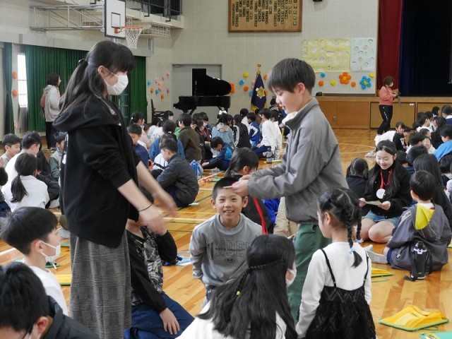 出し物の爆弾ゲームの中で6年生に手作りのプレゼントを渡しました。
