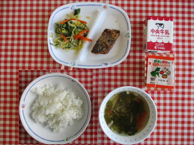 今日の給食は、『ごはん、沢煮わん、おひたし、さわらのから揚げ、ふりかけ(野菜と雑穀)、牛乳』です。