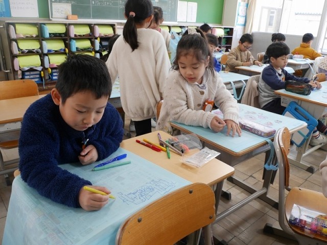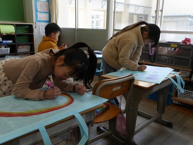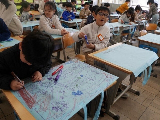 図画などを持ち帰るための作品バッグに思い思いの絵を描いていました。