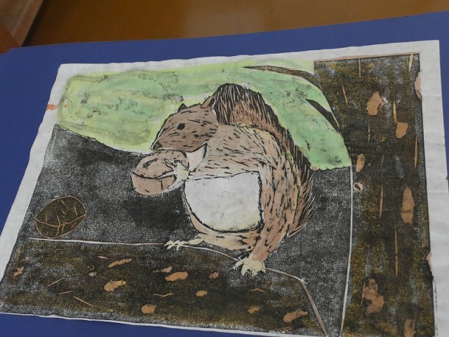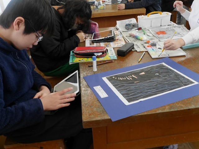 着色した版画を台紙に貼って完成です。