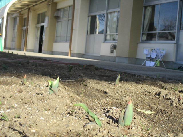 1年教室前花壇に植えたチューリップが目を出して伸びてきました。