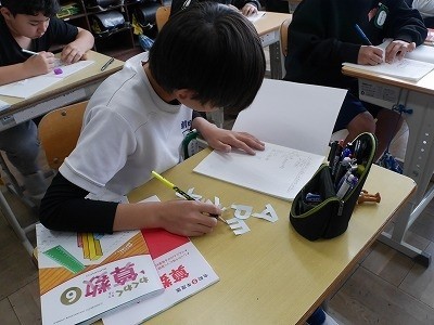 アルファベットの形に紙を切り抜き、折ったり回したりしながら線対称の形や点対称の形を調べていました。