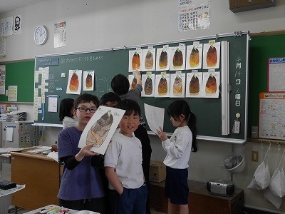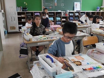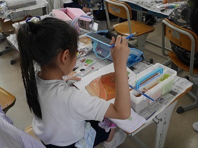 たけのこの下絵に少しずつ色を変えながらグラデーションになるように着色しました。