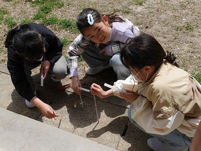 温度計の使い方を学んだ後、校内のいろいろな場所で気温を計っていました。