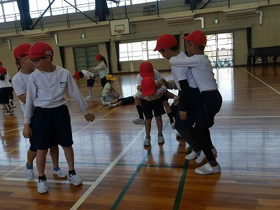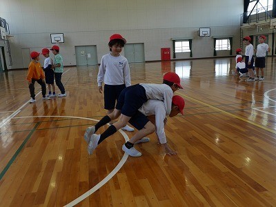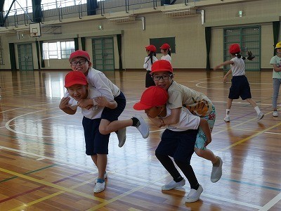ペアになった友達をおんぶして歩く運動をしていました。