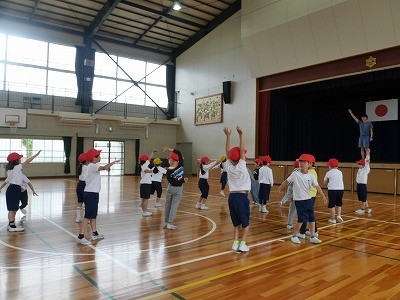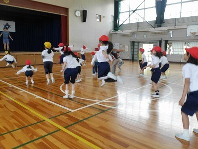 足を伸ばしたまま手のひらで床を触ったり、教師の笛に合わせて跳躍したりと様々な動きを楽しく行いました。