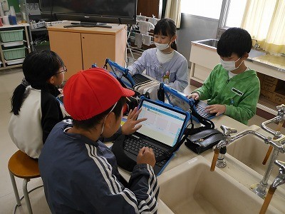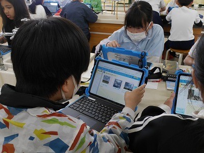 学習用タブレットで撮影した雲の様子を、発表用アプリを使って1枚にまとめていました。