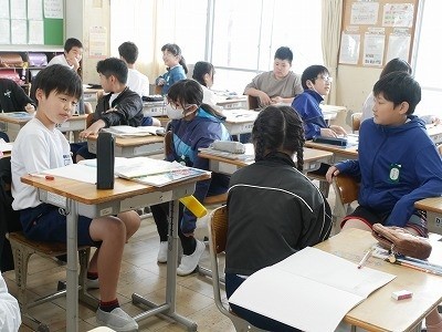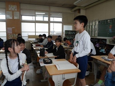 学校にもある多目的トイレの役割から考えを広げ、校内にあるバリアフリー施設にはどのようなものがあるかを話し合っていました。
