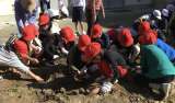 教室前の花壇で、さつまいもほりをしました。みんなで力を合わせると、たくさんのい...