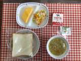 今日の給食は、『スライスパン、大麦と野菜のスープ、フレンチサラダ、チーズオムレツ...