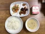今日の給食は、『ごはん、豆乳バランスみそ汁、りっちゃんの元気サラダ、レバーとさつ...
