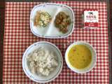 今日の給食は、『麦ごはん、パンプキンポタージュ、チキンサラダ、きんぴらピラフの具...