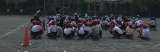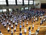 運動場が水浸しだったので、体育館で全校集まってアサヒンピックの練習をしました。