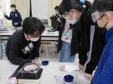 ビーカーに入れたさまざまな水溶液のどれが何かをたしかめるために蒸発皿で熱していま...