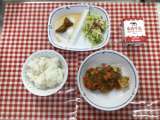 今日の給食は、『三河赤鶏五目ごはん、ふだま汁、野菜のねりごまあえ、さばの塩焼き、...