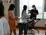 「リボンのおどり」合奏をするために、グループで練習していました。