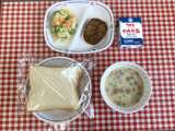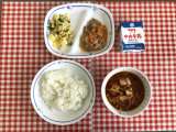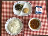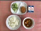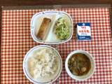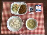 今日の給食は、『麦ごはん、パスタスープ、チキンサラダ、ドライカレー、乾燥小魚、牛...