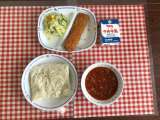 今日の給食は、『豊田めん、トマトソースかけ、コーンサラダ、いかフライ、牛乳』です...