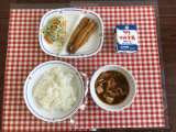 今日の給食は、『ごはん、ワンタンスープ、わかめサラダ、とり肉とごぼうの甘酢煮、牛...