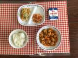 今日の給食は、『ごはん、肉だんごの酢豚風、中華あえ、小エビのから揚げ、牛乳』です...