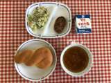 今日の給食は、『ツイストパン、オニオンスープ、ツナサラダ、ハンバーグ、牛乳』です...