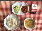 今日の給食は、『麦ごはん、パスタスープ、チーズサラダ、チキンライス、コーヒー牛乳...