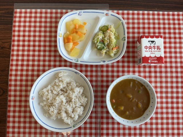 今日の給食は、『麦ごはん、カレーライス、チキンサラダ、ミックスフルーツ、牛乳』で...