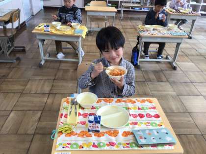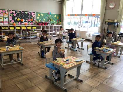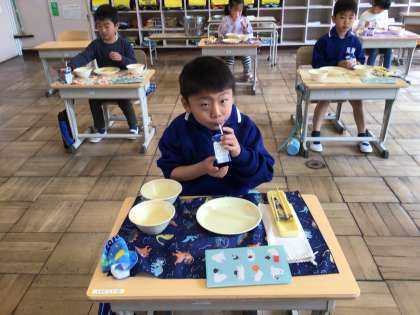 1年生は4時間目から給食の準備をしました。とても静かに準備ができました。